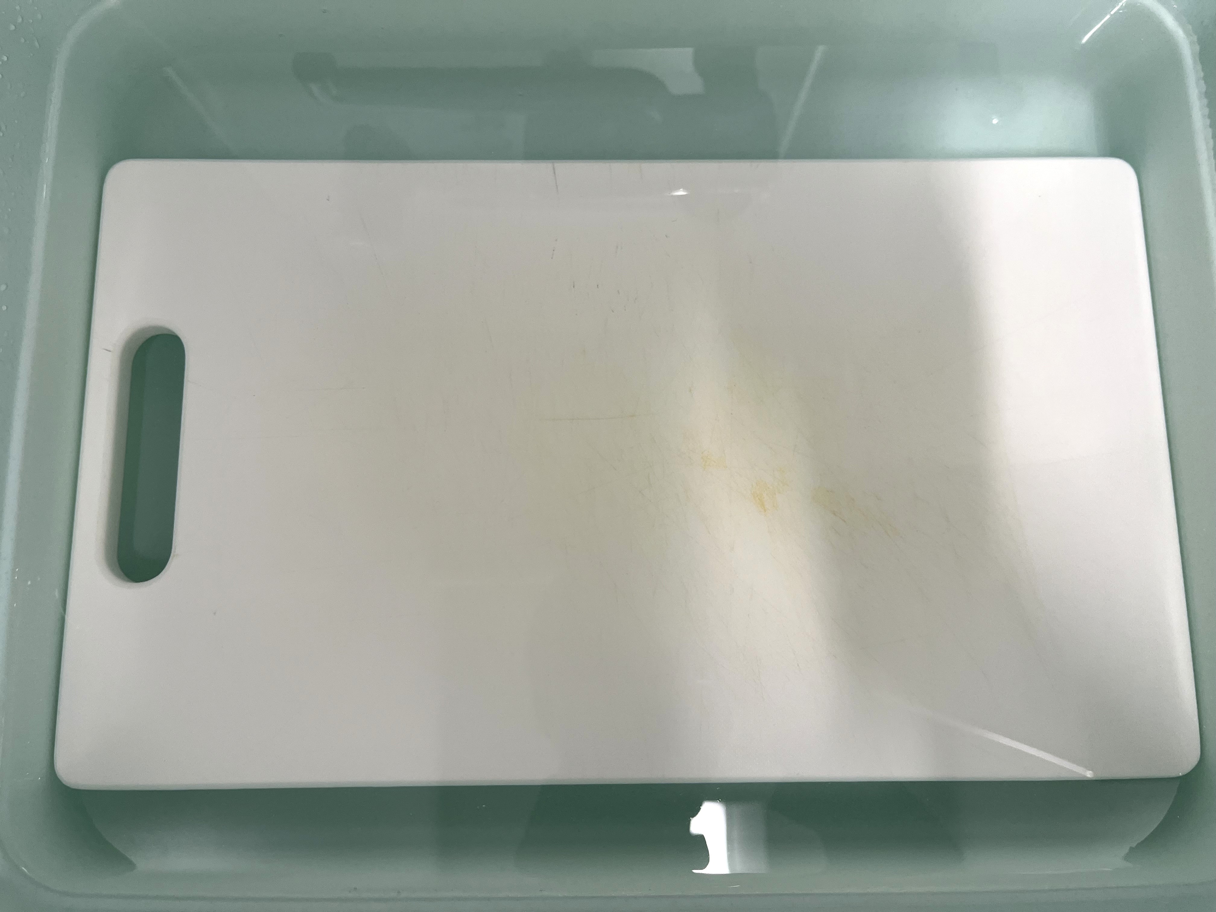 ①台所用漂白剤(塩素系除菌漂白剤)を商品の取扱方法に従い希釈し、まな板を浸漬する。