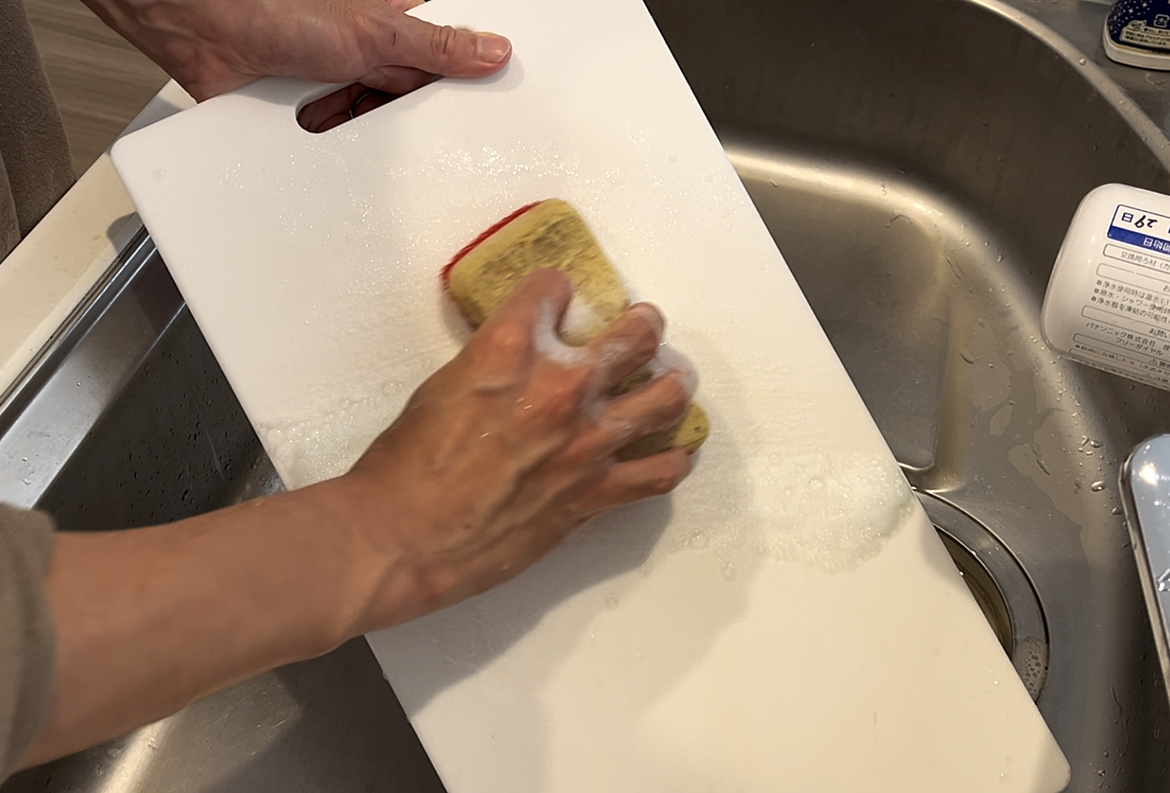特にまな板表面につく包丁の傷目には汚れが入り込みやすく、細菌も増殖しやすいため、縦、横、斜めにこすり洗いする。(包丁の傷目は直線状のため、円状にぐるぐるこするよりも効果的です。)