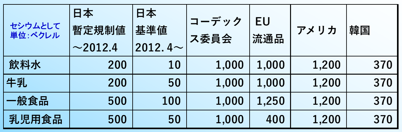 日本では放射能の食品に許容される基準は、食品1kgあたり100ベクレル(セシウム134・137)以下で、水産物もこの基準値が適用されます。たくさん飲む水や牛乳、乳児用の食品はさらに厳しい基準です。