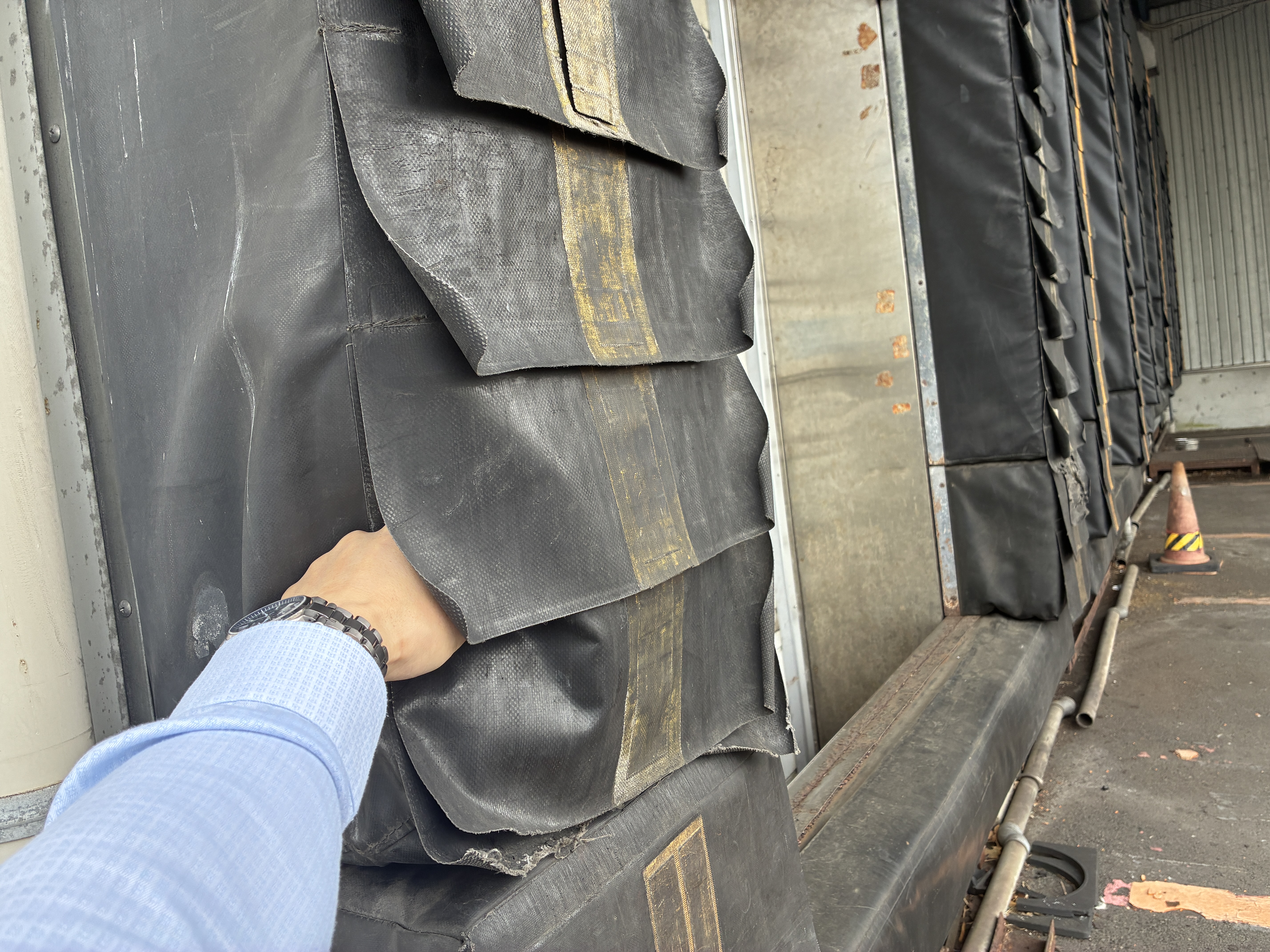 倉庫の人に声をかけて触らせてもらったところ、トラックがお尻を付ける倉庫の黒い部分は柔らかくクッションになっていました。