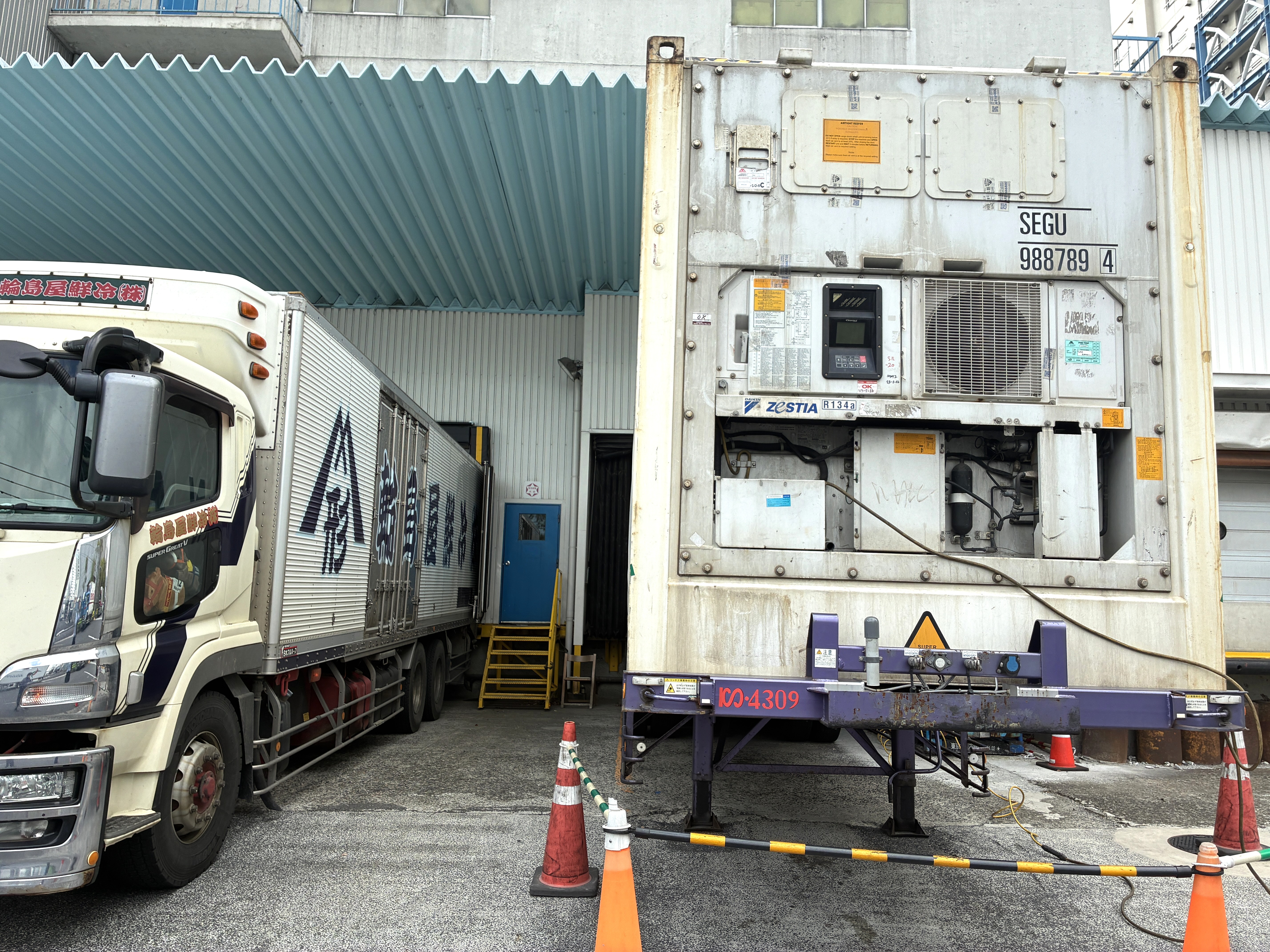 国内の魚介類はトラックで運ばれますが、海外から来る魚介類は船に積み込める仕組みがあります。↓右側がコンテナ!