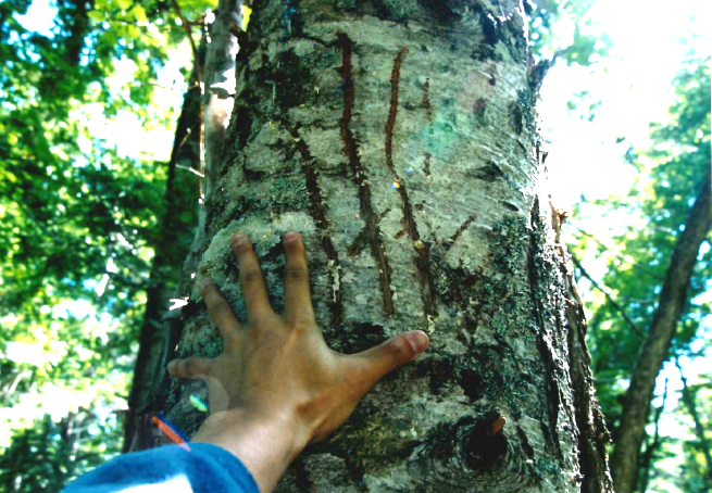 ↓さらに・・・北海道の某大学演習林内で発見したヒグマの爪痕は・・・大きすぎました。
