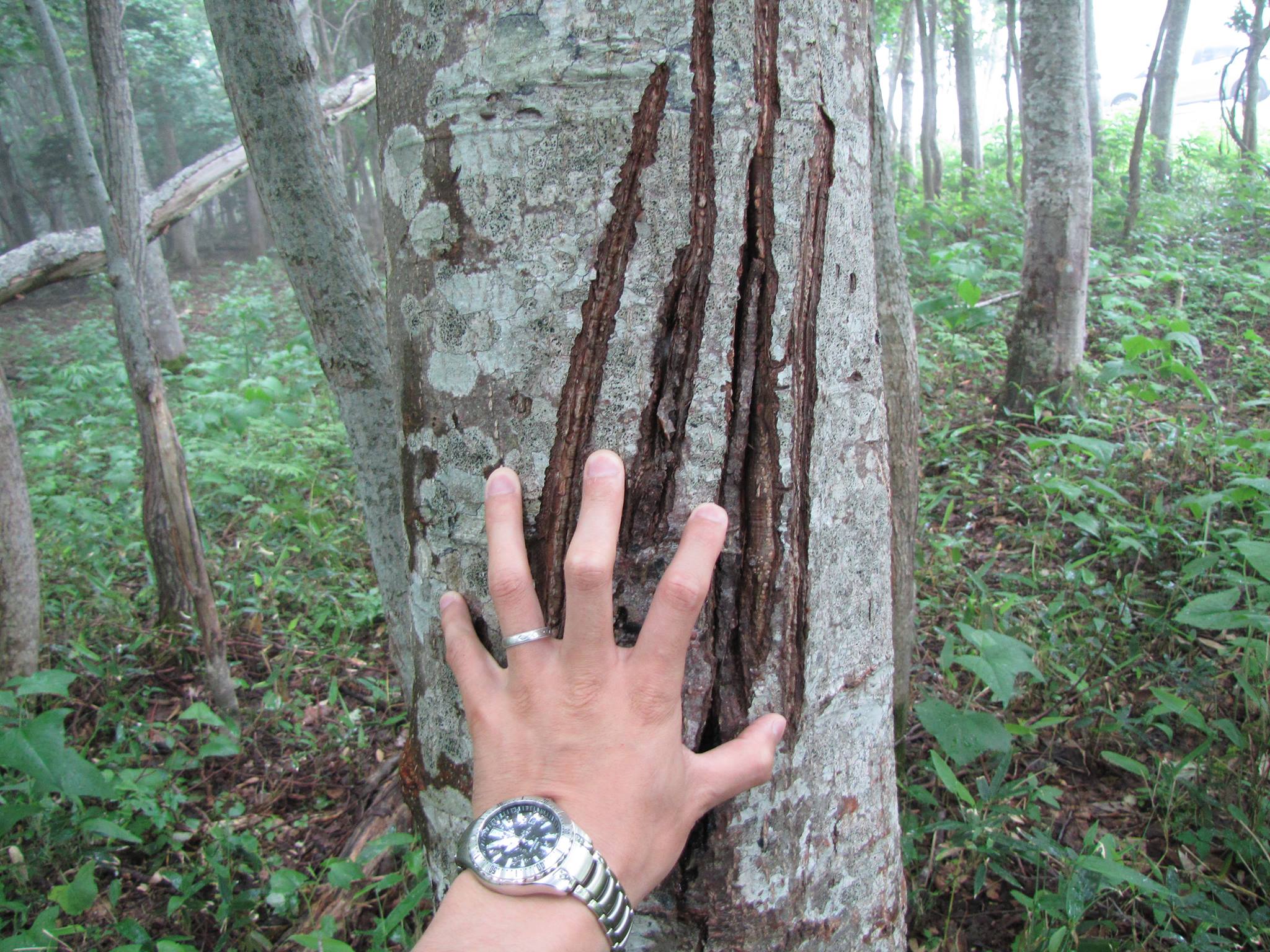 ↓軽井沢の直径30cm程度のウワミズザクラの木に残されたツキノワグマの爪痕と削れた後。