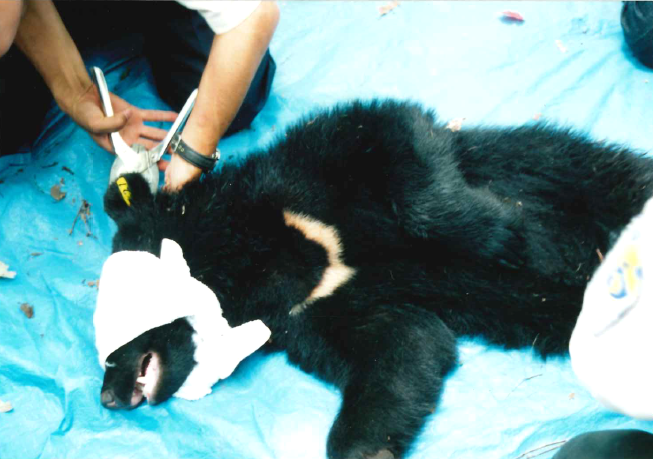 タオルは目をケガさせないため。首元に「月の輪」模様が見える。