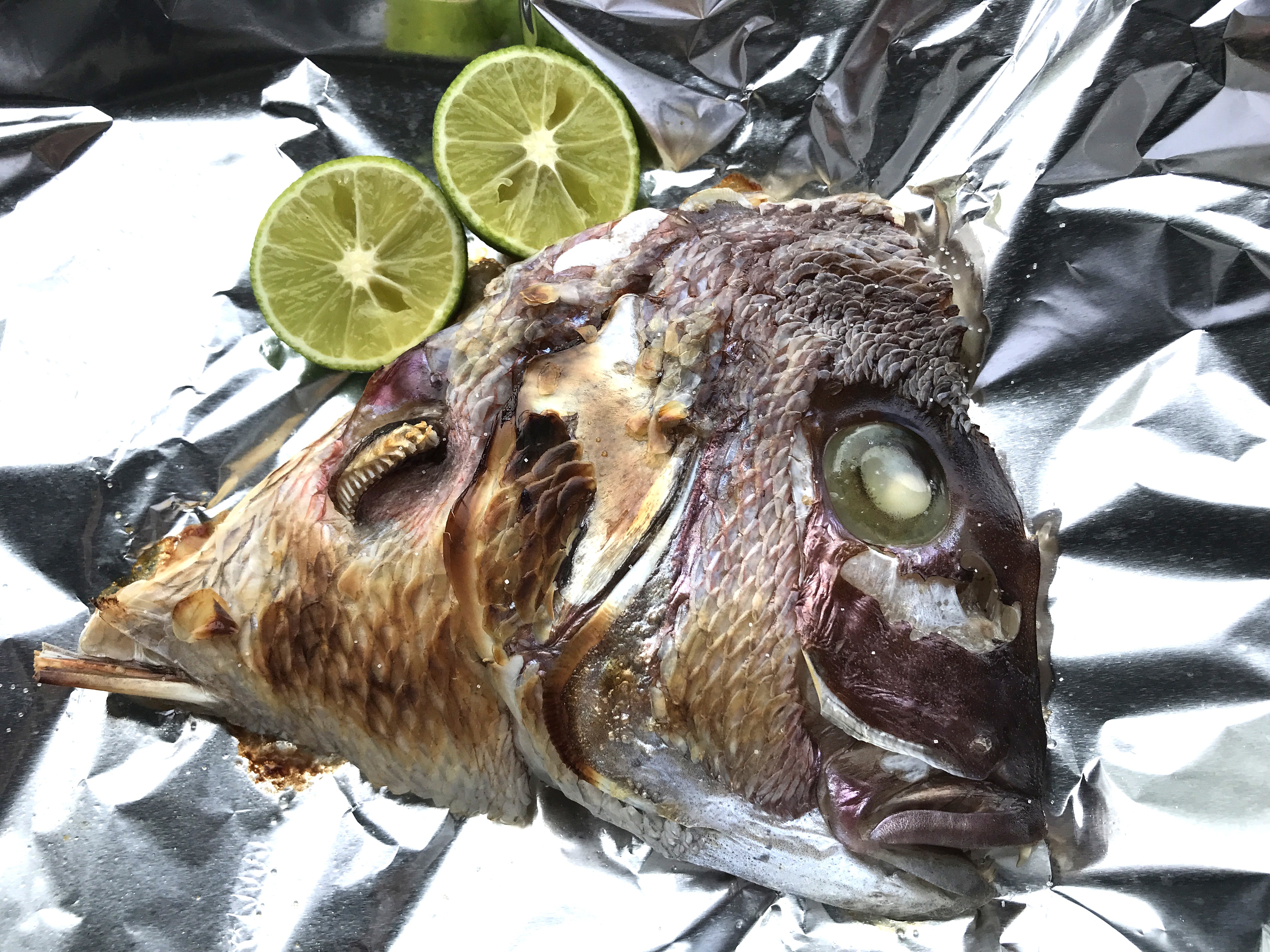 ウロコもうまく焼けたので、ポリポリ食べながら、骨以外はすべて食べます。