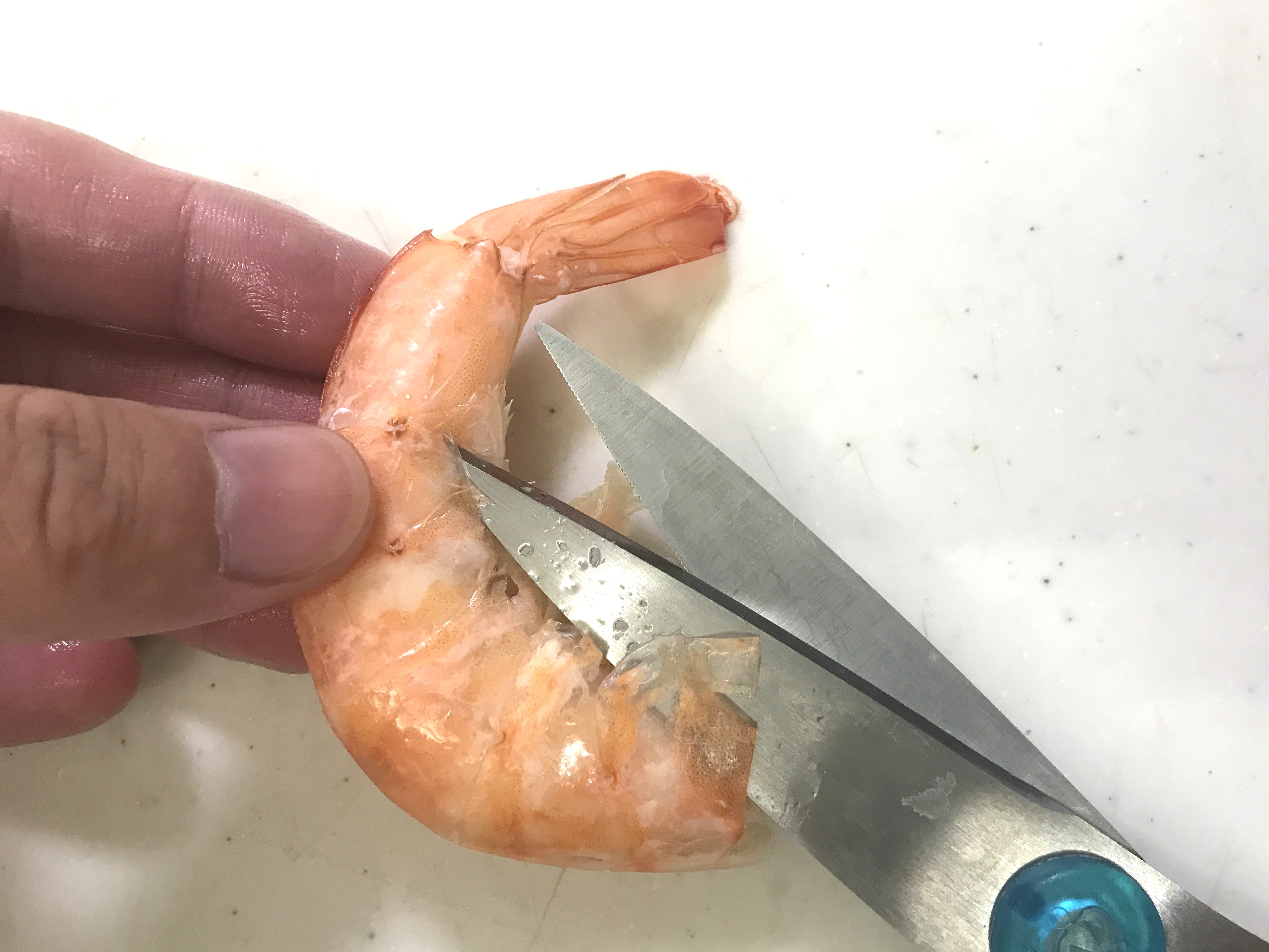 殻は、指で剥きながら・・・もアリですが、ハサミで切れ目を入れておくと剥きやすくなります。