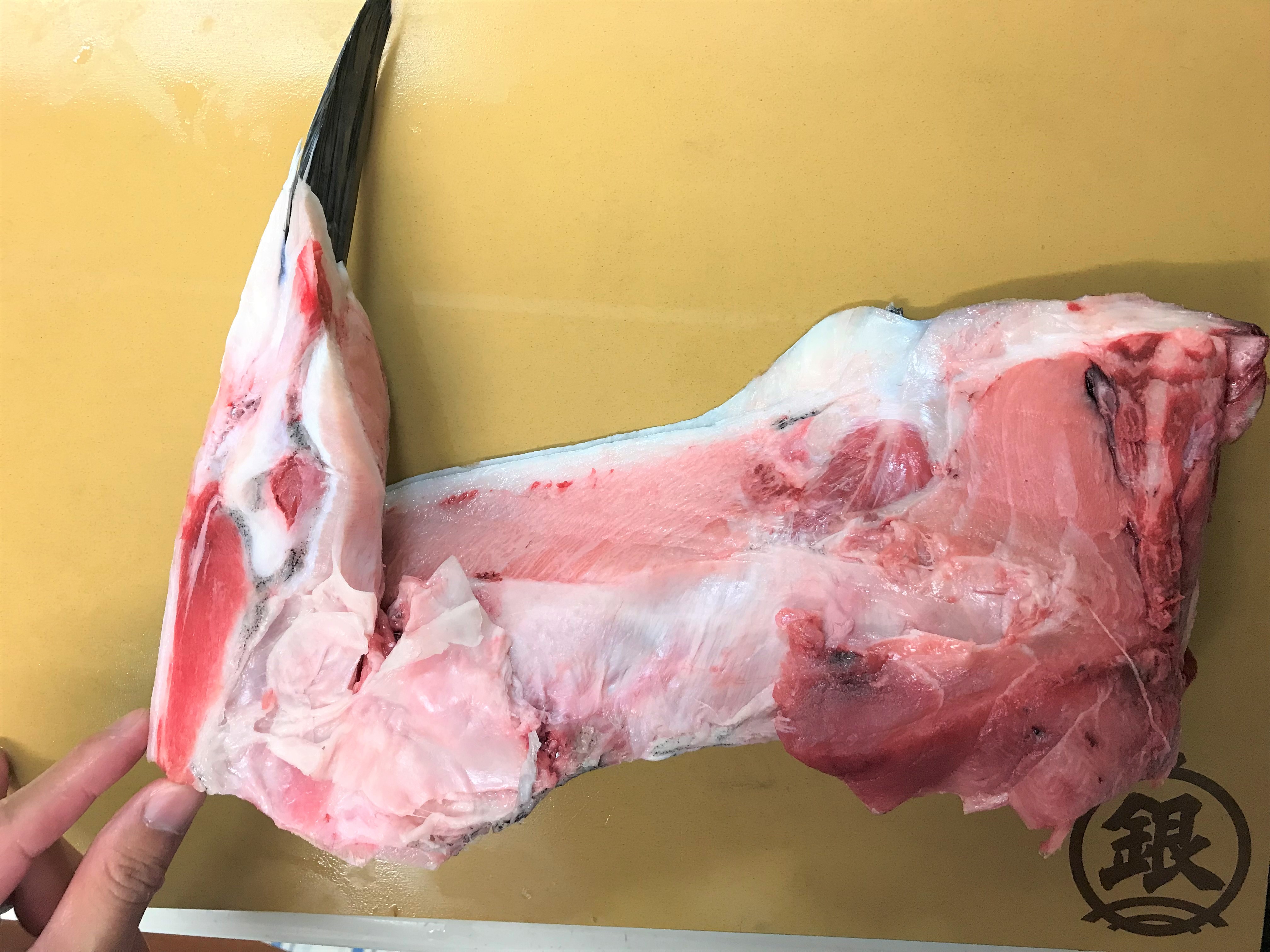 メバチマグロのカマ(左が頭、上が背中。上の丸い切れ目はムナビレの跡)