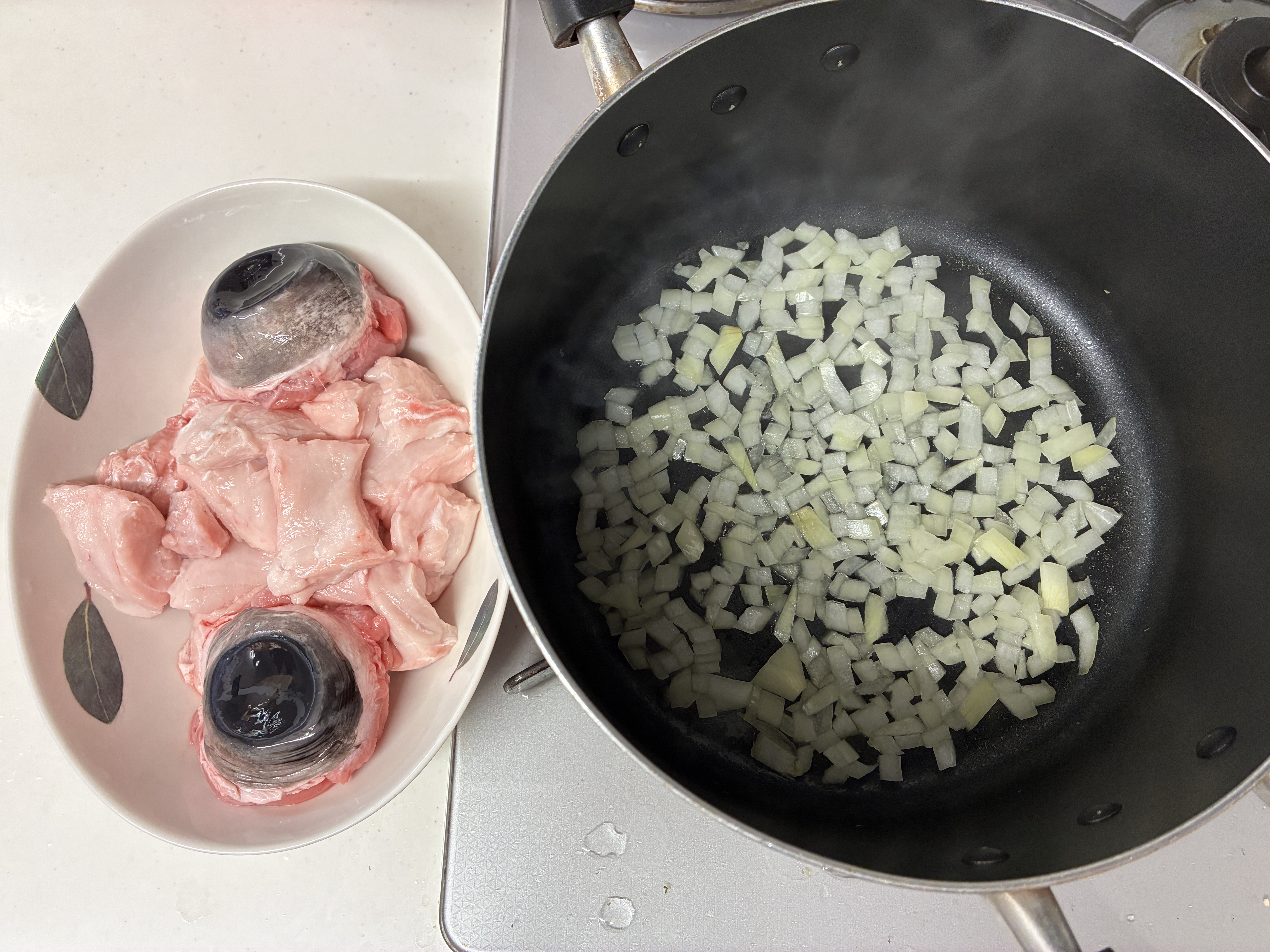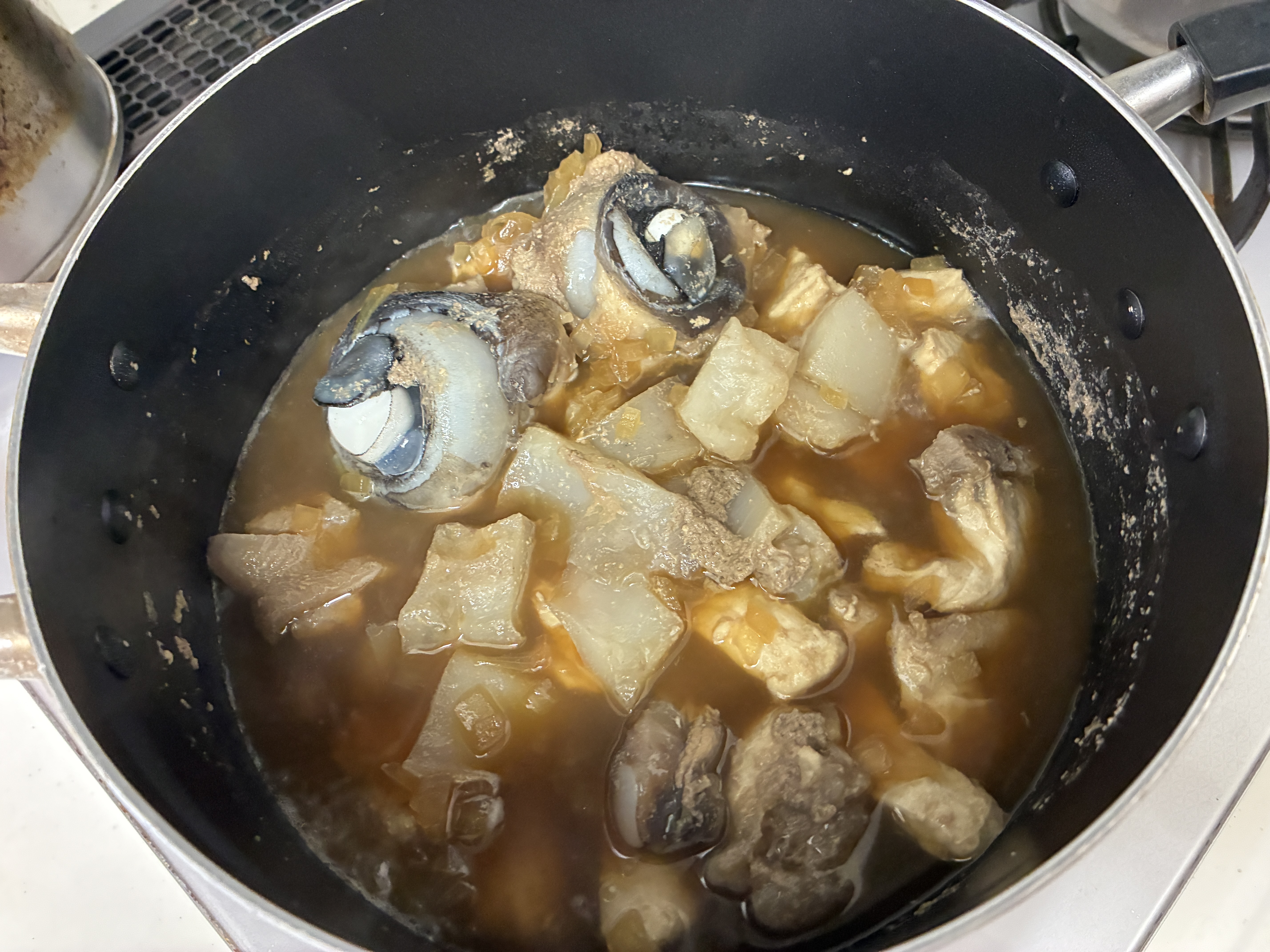 モウカザメの目玉と顎肉周辺の身で煮付け。↓オマケに皮下のゼラチンも投入して出来上がり!